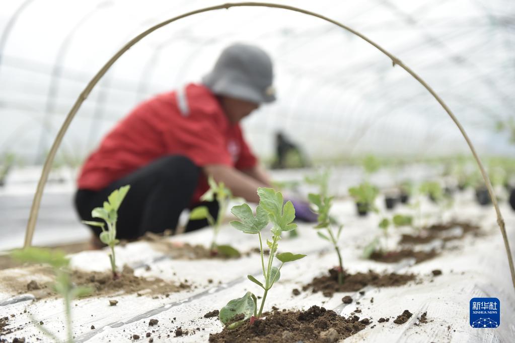 2月24日,河南省沁陽(yáng)市西向鎮捏掌村,農民在栽種西瓜秧苗。