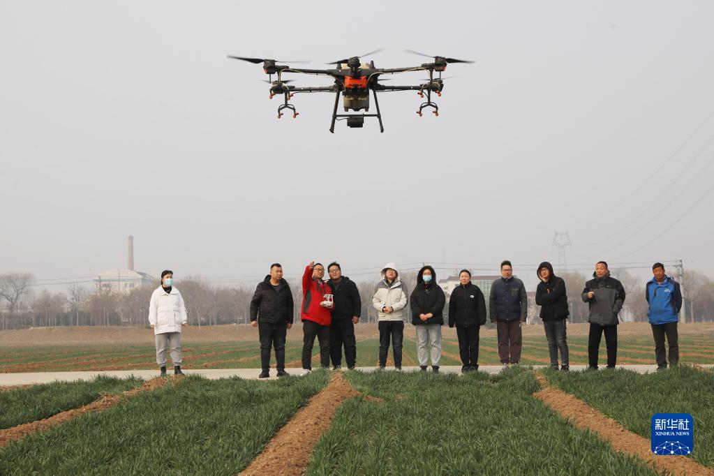 2月24日,在河南省焦作市溫縣溫泉街道后東南王村,學(xué)員在農業(yè)植保無(wú)人機操作員培訓班上觀(guān)摩無(wú)人機飛行演示。