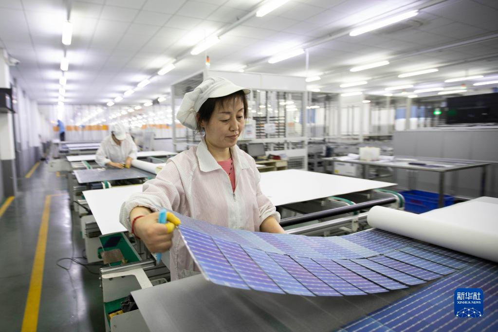 2月24日,在山東省東營(yíng)市廣饒縣的東營(yíng)大??屏止怆娪邢薰局悄芑?yáng)能組件生產(chǎn)車(chē)間,工人在生產(chǎn)出口的光伏組件。