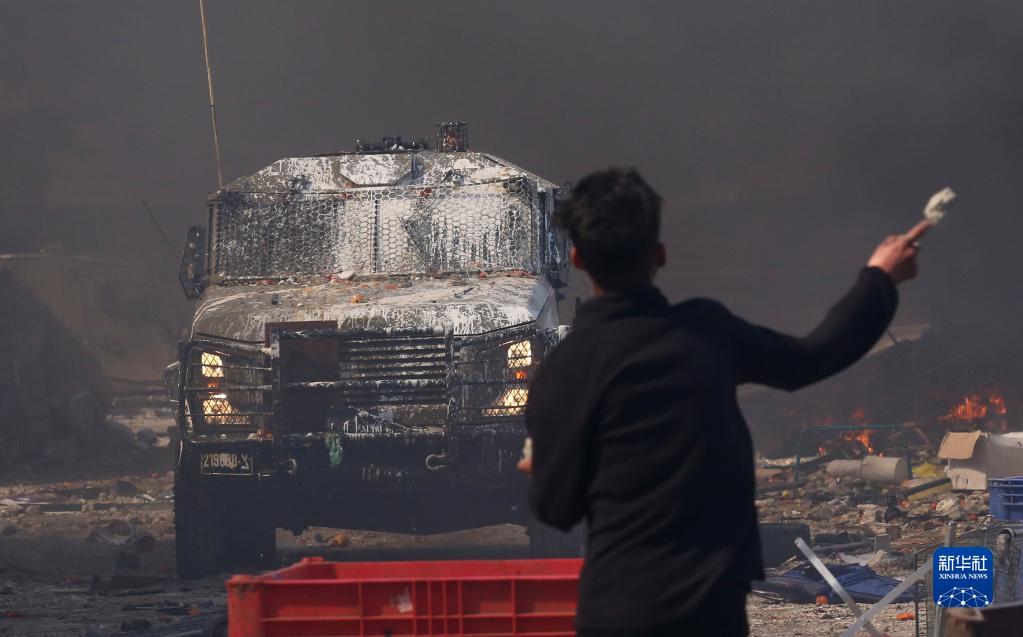 2月22日,在約旦河西岸城市納布盧斯,巴勒斯坦人向以色列軍車(chē)投擲石塊。