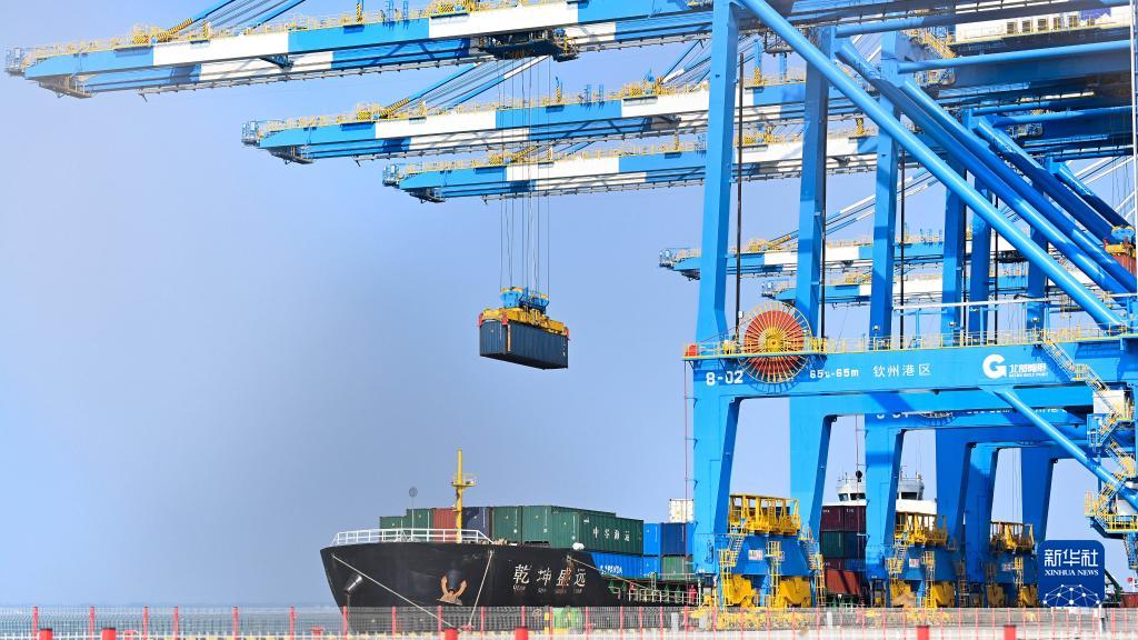 2月25日,在廣西欽州港自動(dòng)化集裝箱碼頭,塔吊在運送集裝箱。