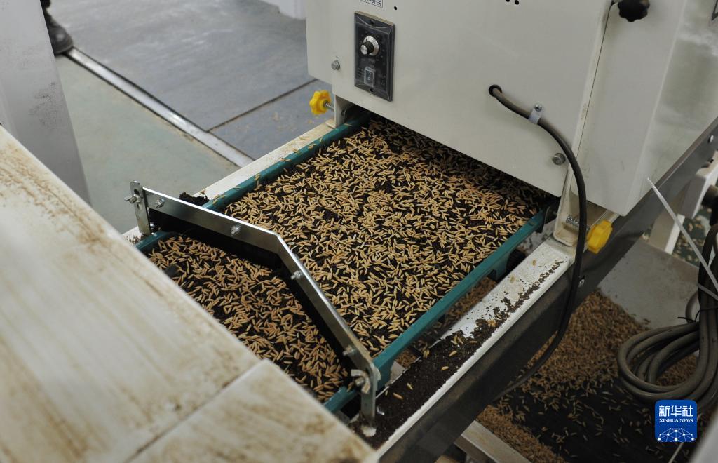 2月24日,在涇口鄉工廠(chǎng)化智能育秧中心,自動(dòng)化裝備將種子秧土按照比例均勻鋪到秧盤(pán)上。