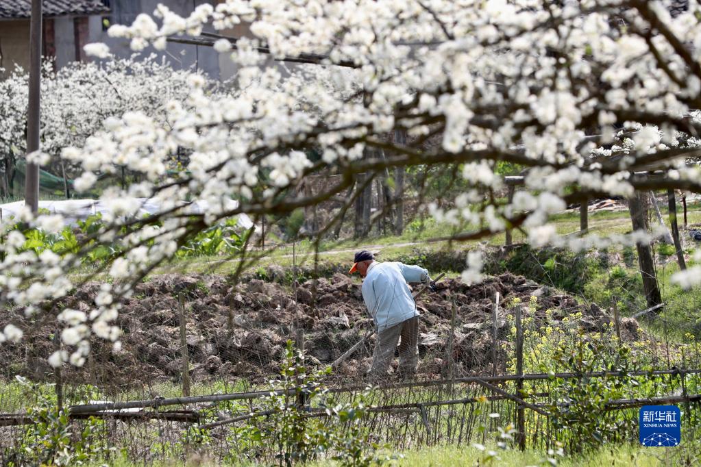 福州市永泰縣蓋洋鄉前湖村村民在李樹(shù)旁勞作(2月24日攝)。