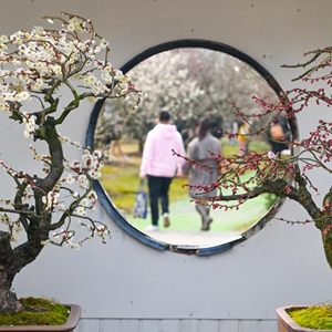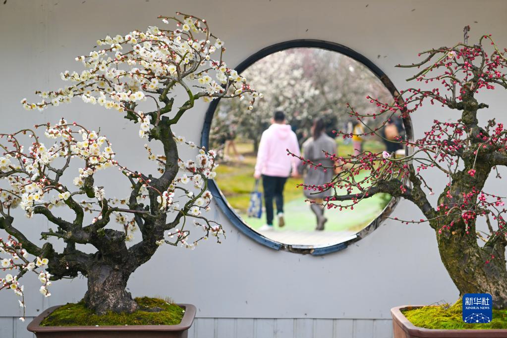 2月18日,游客在江蘇省第二十七屆蘇州太湖梅花節香雪海梅花盆景展上欣賞梅花。