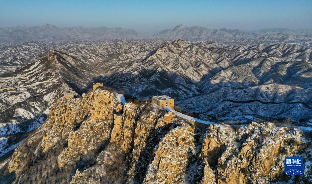 這是2月19日在晨曦中拍攝的雪后司馬臺長(cháng)城(無(wú)人機照片)。