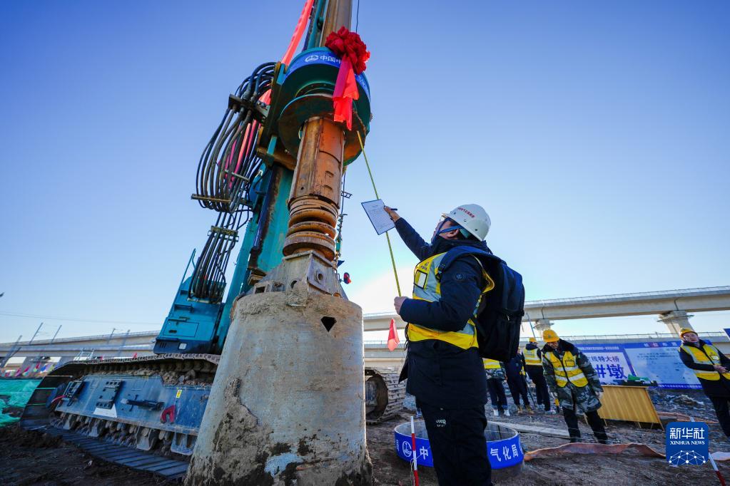 2月25日,中鐵電氣化局的施工人員在雄忻高鐵新蓋房特大橋建設現場(chǎng)指揮鉆孔作業(yè)。