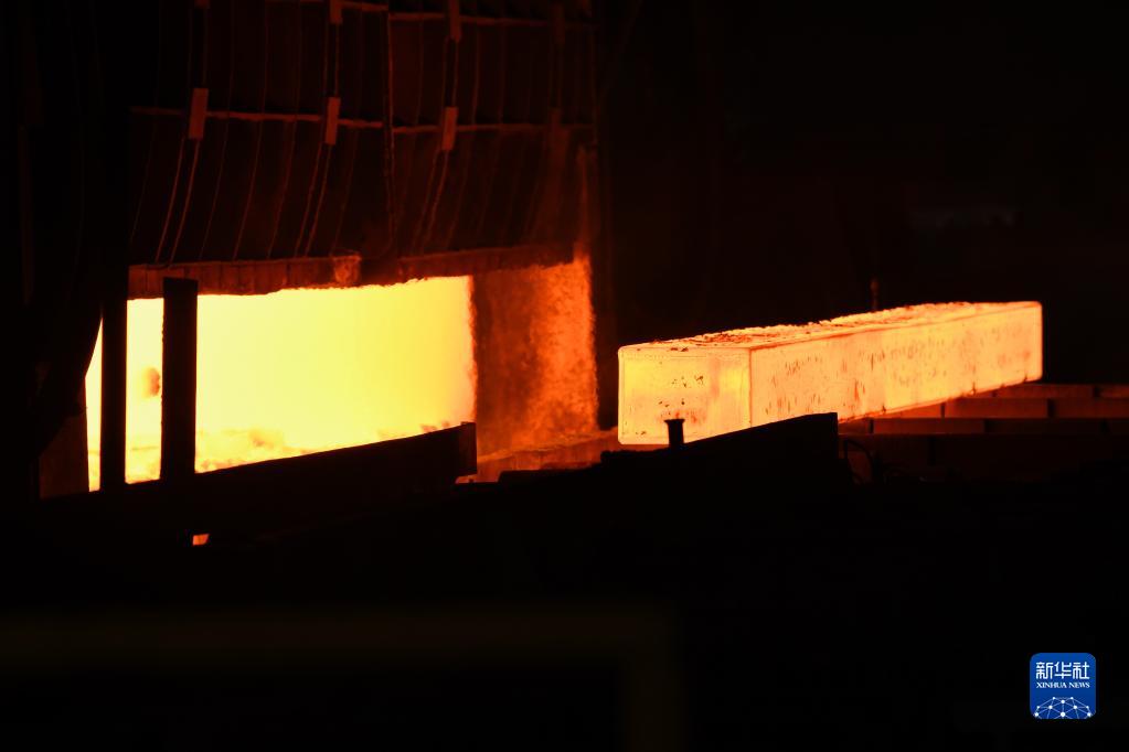 在攀鋼釩軌梁廠(chǎng)鋼軌生產(chǎn)線(xiàn)上,鋼坯經(jīng)加熱后出爐(2月24日攝)。