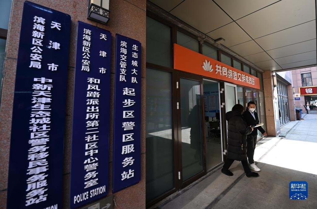 居民在辦理完業(yè)務(wù)后離開(kāi)中新天津生態(tài)城第二社區中心警務(wù)室(2月24日攝)。