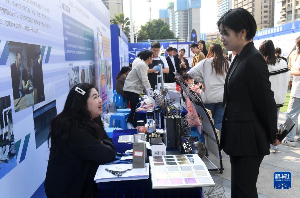 2月25日,在廣西南寧市青秀萬(wàn)達廣場(chǎng),人們在創(chuàng )業(yè)展現場(chǎng)交流。