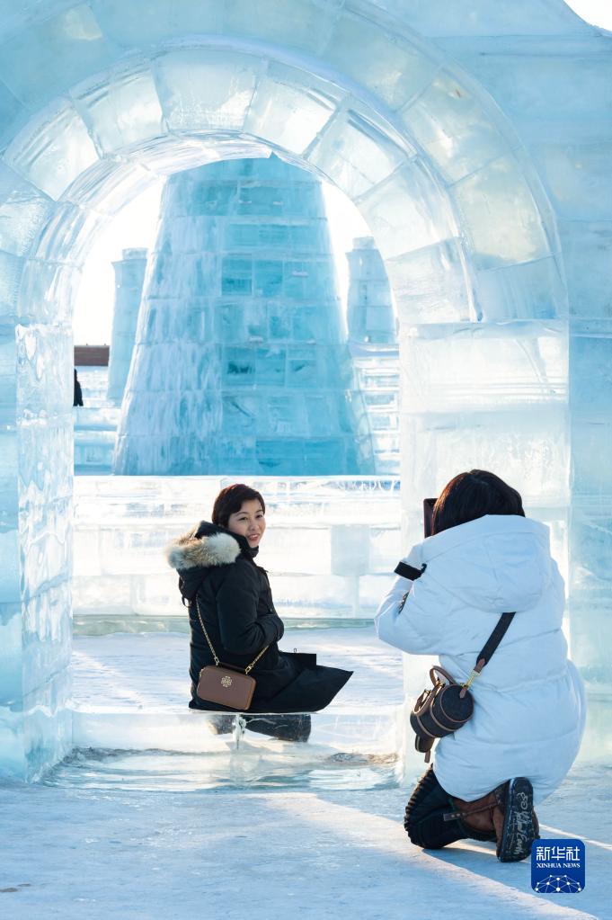 2月25日,游客在哈爾濱冰雪大世界園區留影。
