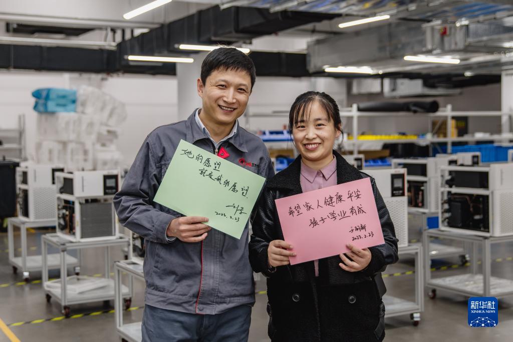 在萊伯泰科(天津)科技有限公司,劉學(xué)(左)和于麗新展示他們寫(xiě)下的心愿(2月23日攝)。今年37歲的劉學(xué)曾在北京工作多年。2019年,他和妻子于麗新一起被派到天津寶坻京津中關(guān)村科技城,參與分公司的設立?,F在他們一家人已經(jīng)在天津落戶(hù)。于麗新希望家人健康平安、孩子學(xué)業(yè)有成。劉學(xué)說(shuō),妻子的愿望就是他的愿望。