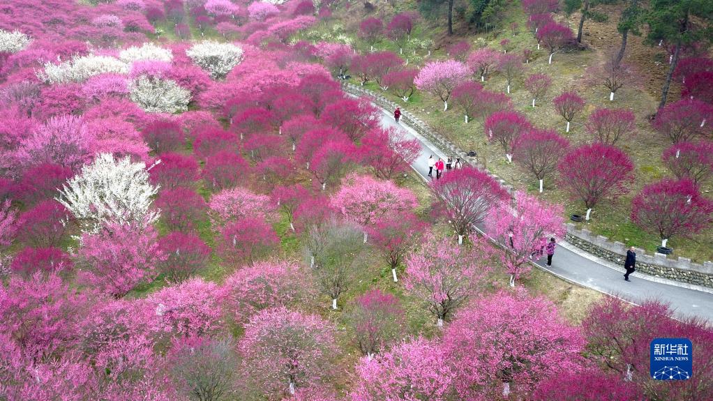 2月25日,游人在湖北省十堰市茅箭區秦巴生態(tài)植物園賞花游玩(無(wú)人機照片)。