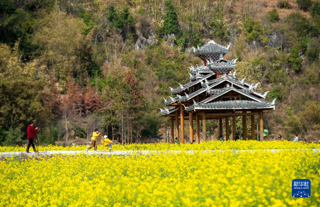 2月25日,人們在貴州省黔東南苗族侗族自治州從江縣洛香鎮上皮林村油菜花田間賞花游玩。