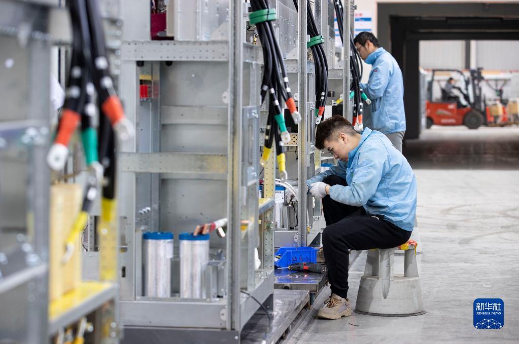 在位于寧夏同心工業(yè)園區清潔能源產(chǎn)業(yè)園的上能電氣(寧夏)有限公司車(chē)間內,工人為逆變器安裝開(kāi)關(guān)(2月23日攝)。