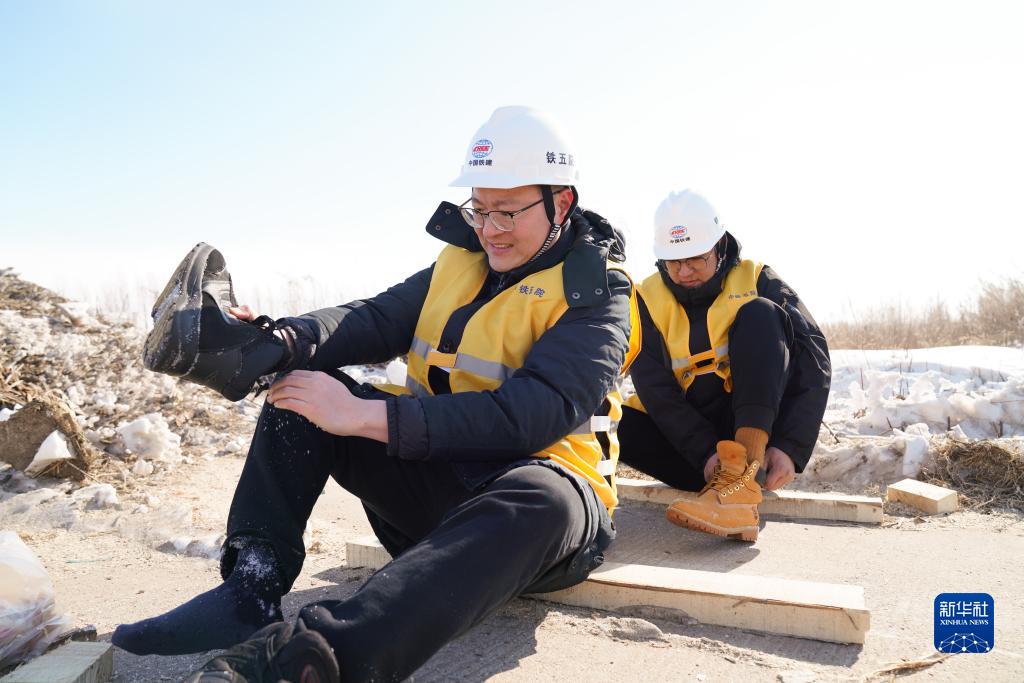 2月25日,黃騰(前)與同事在鐵路沿線(xiàn)清理鞋中的積雪。