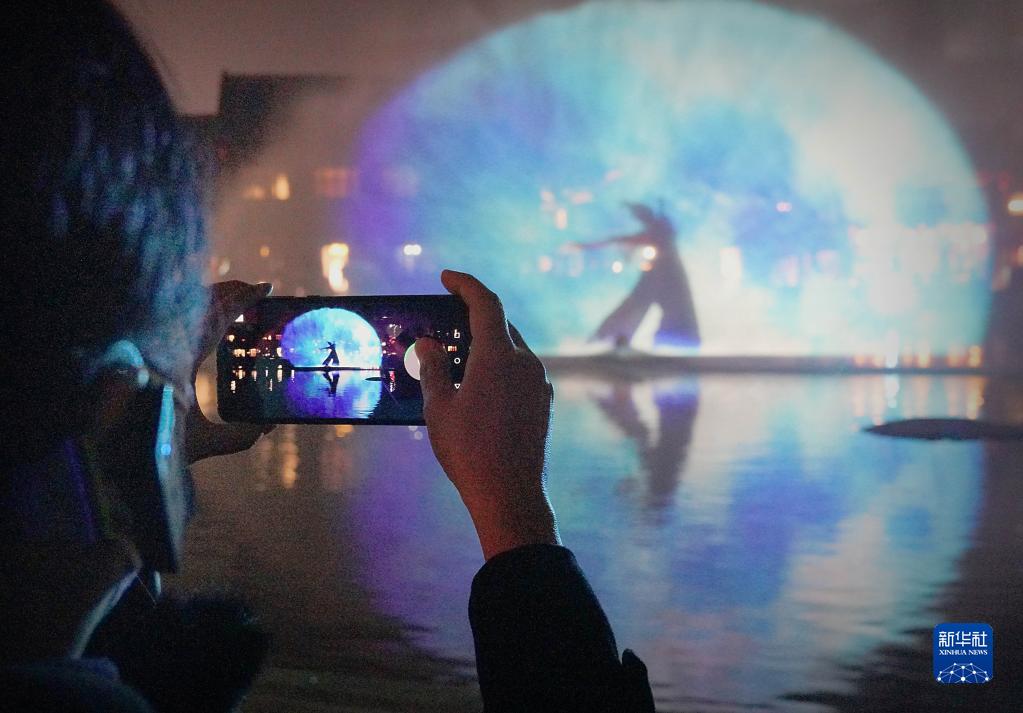 游客在洛陽(yáng)市洛邑古城內觀(guān)看水幕電影(2月22日攝)。
