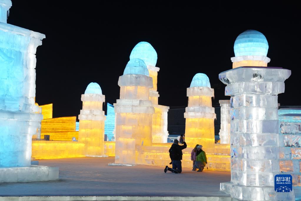 2月25日,游客在哈爾濱冰雪大世界園區拍照。