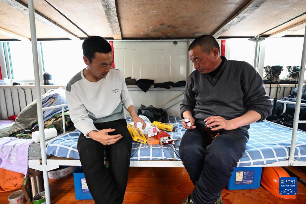 2月22日,烏龍岱林場(chǎng)402工隊職工溫樹(shù)昌(左)和工友何建山在駐點(diǎn)的移動(dòng)板房?jì)日硭幤贰?/p>