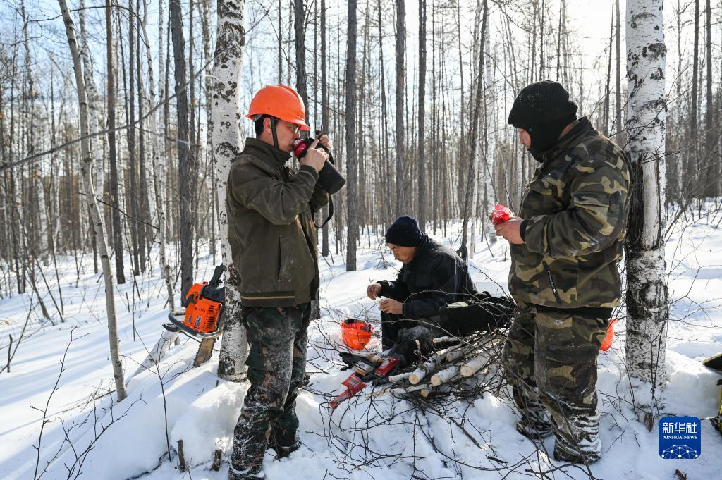 2月23日,烏龍岱林場(chǎng)職工在山林中趁作業(yè)間隙簡(jiǎn)單吃點(diǎn)小食當午餐。