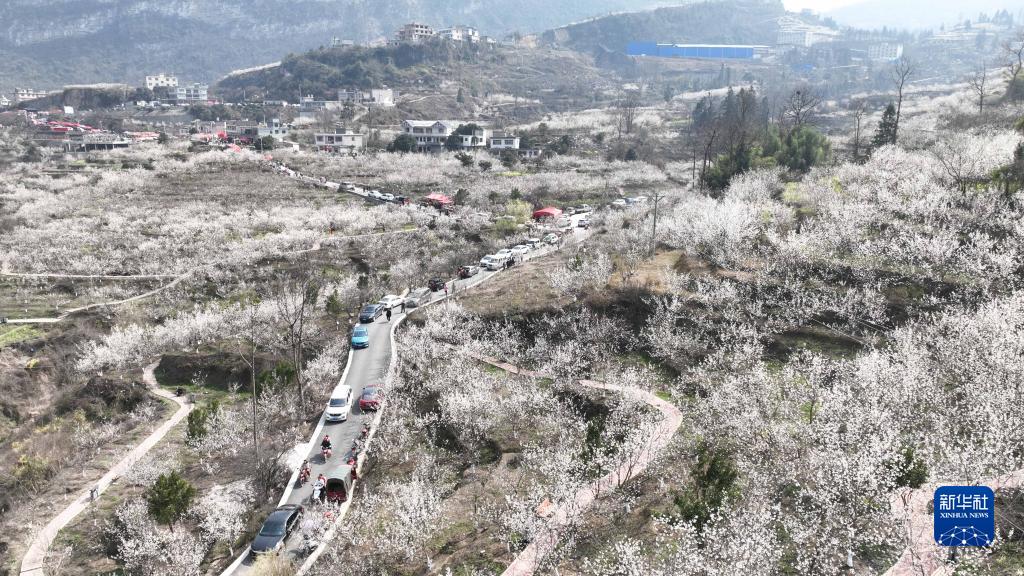 2月26日,游客在貴州省畢節市織金縣馬場(chǎng)鎮中心村櫻桃基地賞花游玩(無(wú)人機照片)。