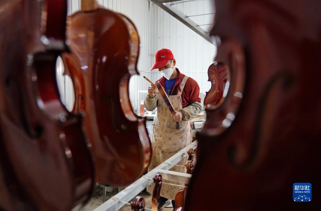 河北省武強縣一家西洋樂(lè )器生產(chǎn)企業(yè)的員工給小提琴刷漆(2月23日攝)。