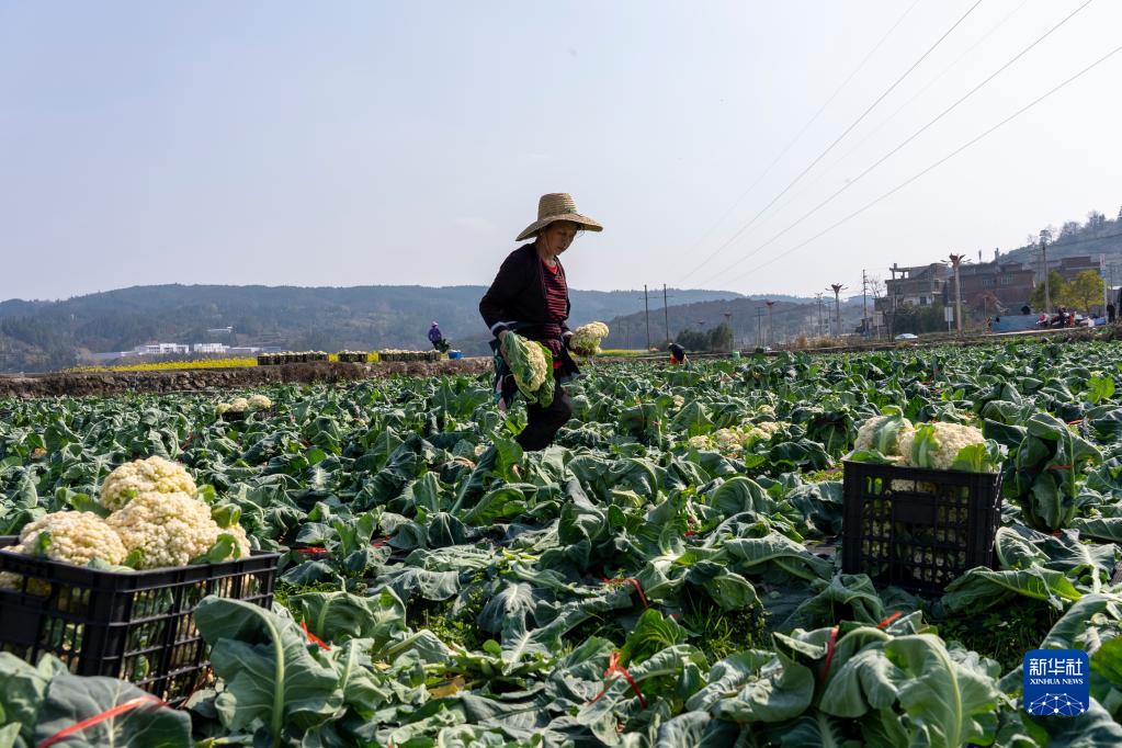 2月26日,在貴州省從江縣貫洞鎮貫洞村松花菜種植基地,菜農在田間采摘松花菜。