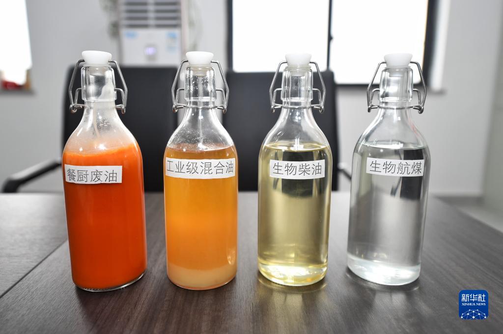 這是四川一家環(huán)??萍加邢薰菊故镜牟蛷N廢油、工業(yè)級混合油、生物柴油和生物航空煤油樣品(2月21日攝)。
