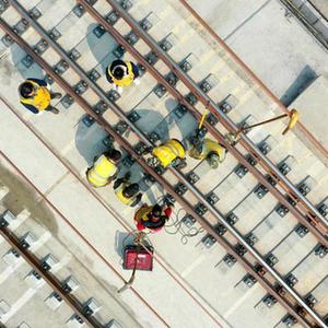 2月27日,在貴南高鐵都勻東站附近,貴陽(yáng)高鐵工務(wù)段的技術(shù)人員進(jìn)行精調工作(無(wú)人機照片)。