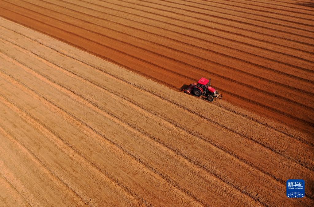 2月27日,在江西省吉安市泰和縣沿溪鎮草坪村,大型拖拉機在翻耕整地(無(wú)人機照片)。