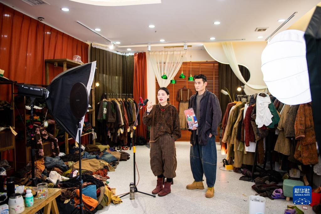 2月28日,主播在湖南省株洲市蘆淞區華麗服裝批發(fā)大市場(chǎng)直播銷(xiāo)售服裝。