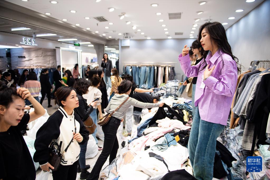 2月28日,模特(右一)在湖南省株洲市蘆淞區華麗服裝批發(fā)大市場(chǎng)向批發(fā)商展示服飾。