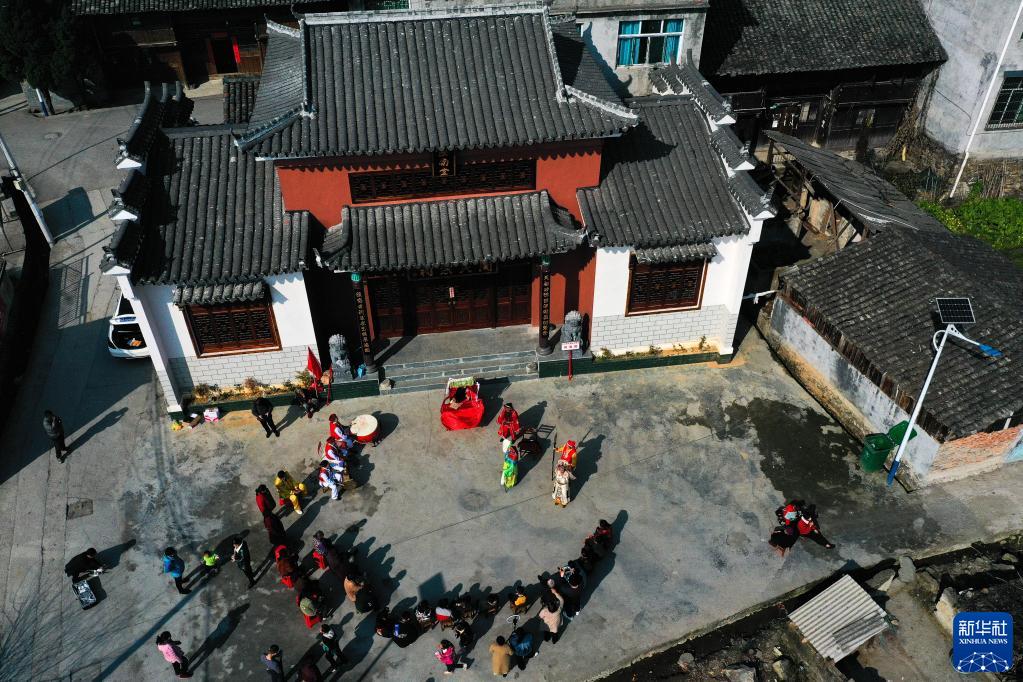 侗戲班在貴州省天柱縣鳳城街道潤松村表演侗戲(2月26日攝,無(wú)人機照片)。
