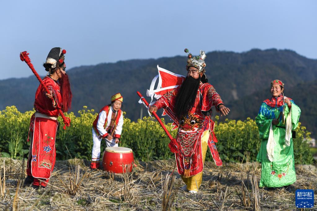 侗戲班在貴州省天柱縣鳳城街道潤松村的田野里排練侗戲(2月26日攝)。