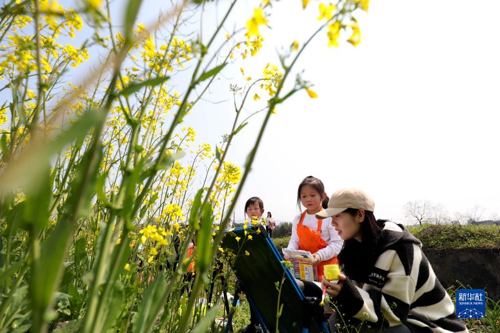2月28日,在湖南省資興市唐洞街道高碼村,老師指導小朋友在油菜花田旁畫(huà)畫(huà)。