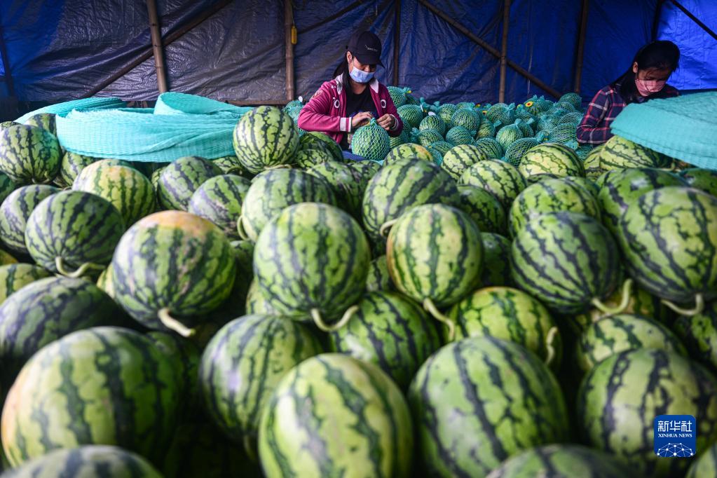 農戶(hù)在海南省儋州市中和鎮打包采收的麒麟西瓜(2月24日攝)。