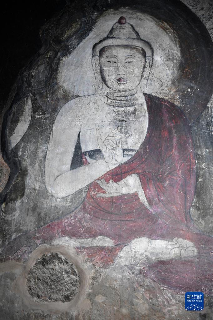 這是寧夏須彌山石窟圓光寺48號窟內完成修復的壁畫(huà)(2月28日攝)。
