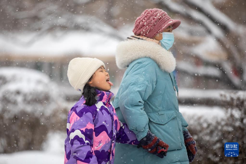 3月1日,在哈爾濱市古梨園,一名小朋友伸出舌頭品嘗雪花。