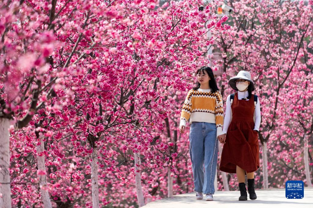3月1日,兩名游客在宜良縣山后櫻花谷觀(guān)光游覽。