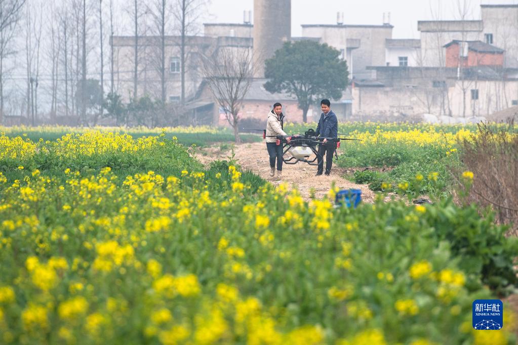 3月1日,在湖北省天門(mén)市黃潭鎮一處油菜田,村民準備利用植保無(wú)人機進(jìn)行噴藥作業(yè)。