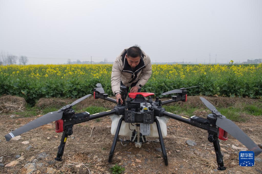 3月1日,在湖北省天門(mén)市黃潭鎮一處油菜田,村民準備利用植保無(wú)人機進(jìn)行噴藥作業(yè)。
