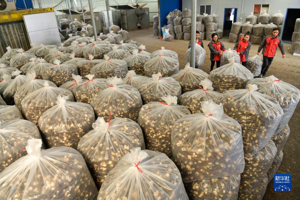 工人在貴州省天柱縣藍田鎮發(fā)鑫羊肚菌產(chǎn)業(yè)園搬運已烘干的羊肚菌(2月27日攝)。
