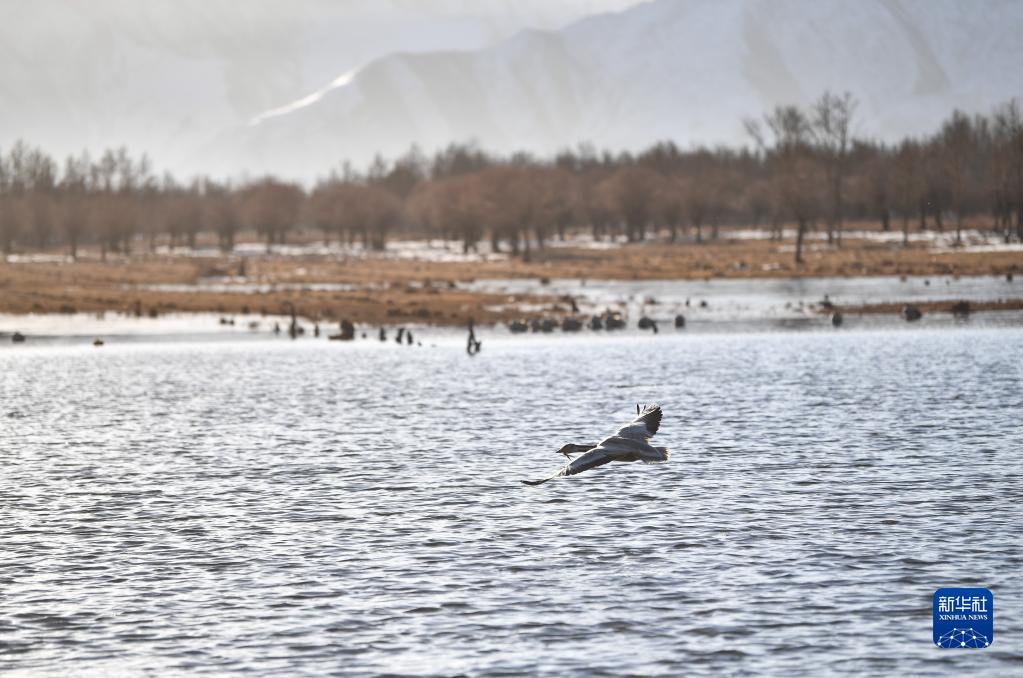 在拉薩市林周縣唐嘎鄉,斑頭雁在拉薩河上空飛翔(3月1日攝)。