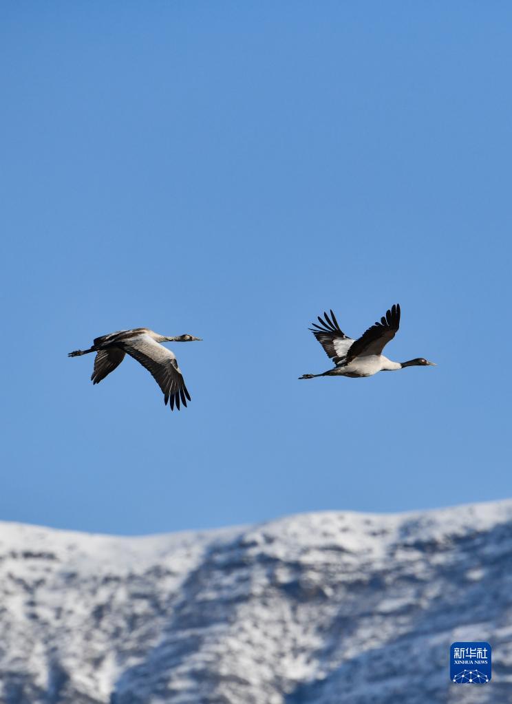 在拉薩市林周縣唐嘎鄉,黑頸鶴在雪山前飛翔(3月1日攝)。