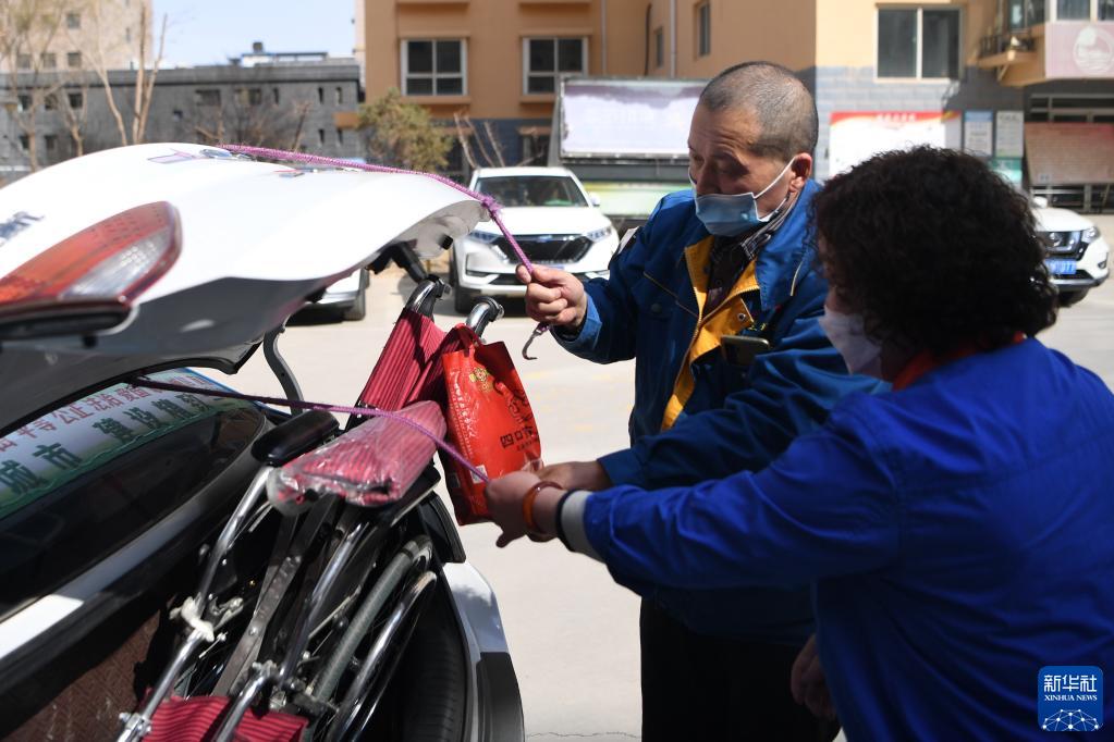 強漢紅(左)和同事胡建萍將老人的輪椅放入后備箱并固定好準備出發(fā)(3月1日攝)。