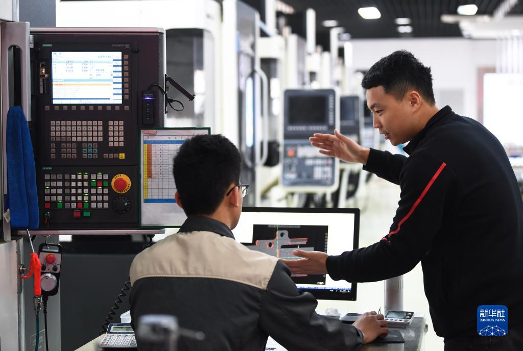 在廣東省機械技師學(xué)院數控銑集訓基地,楊登輝(右)指導學(xué)生操作機床(2月14日攝)。