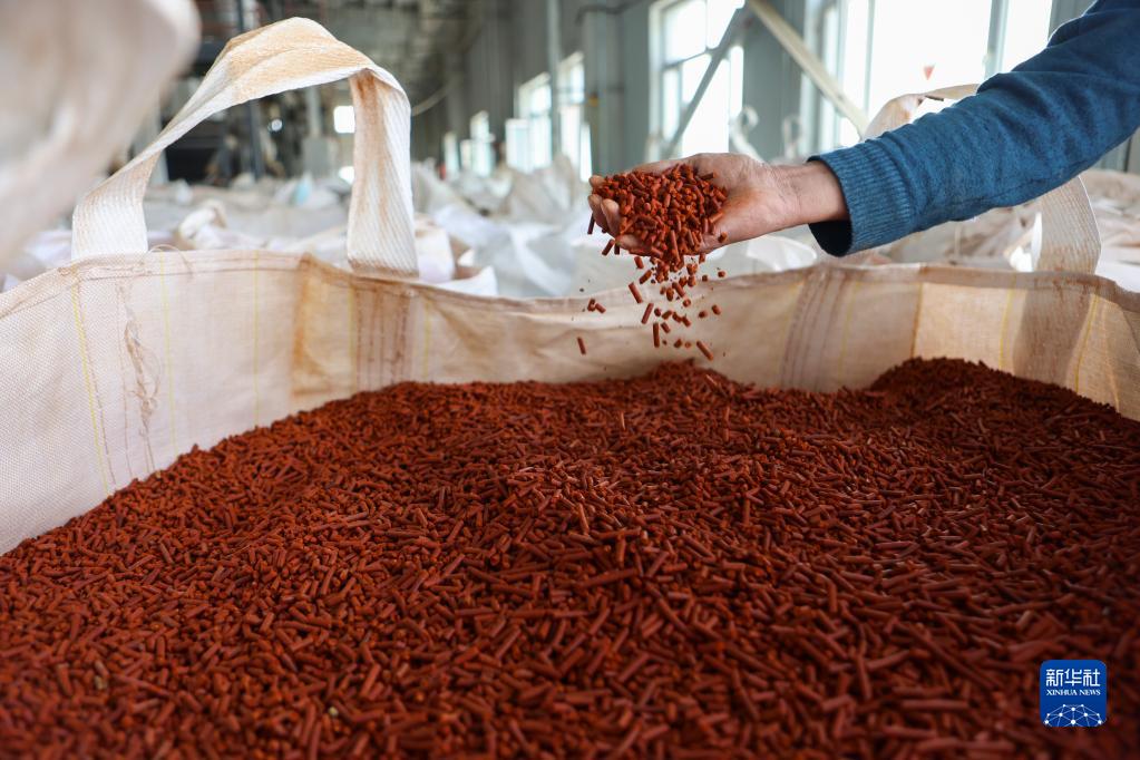 3月1日在和田縣塔瓦庫勒鄉辣椒產(chǎn)業(yè)園拍攝的辣椒初加工形成的顆粒。