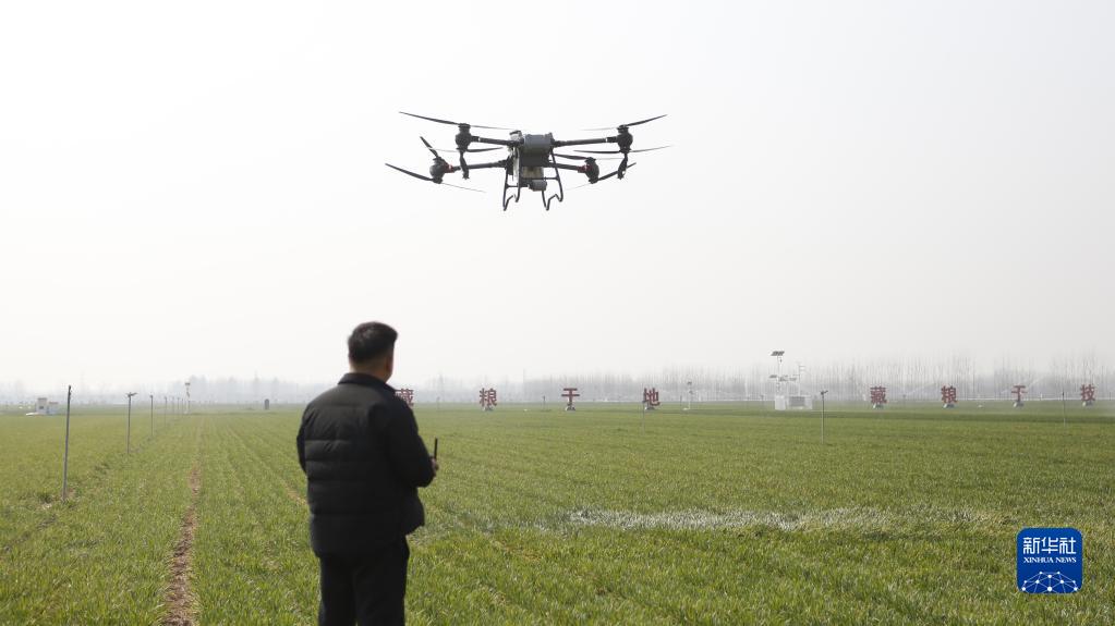 3月2日,河南省尉氏縣張市鎮農民用植保無(wú)人機在田間為小麥噴灑葉面肥。