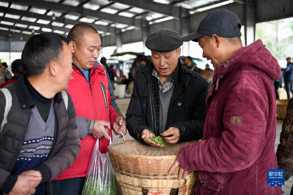 3月2日,在雅安市名山區雙河鮮葉交易市場(chǎng)內,茶農與茶企在進(jìn)行茶葉交易。