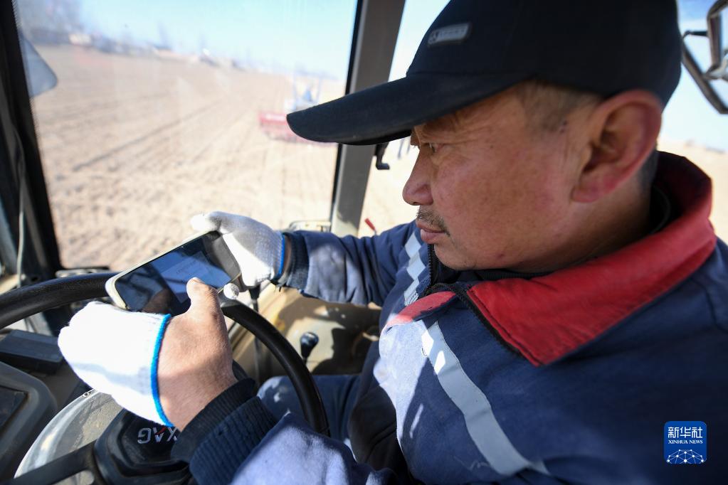 3月3日,在寧夏銀川市賀蘭縣立崗鎮銀星村,一名農機手調試北斗導航系統準備進(jìn)行播種作業(yè)。