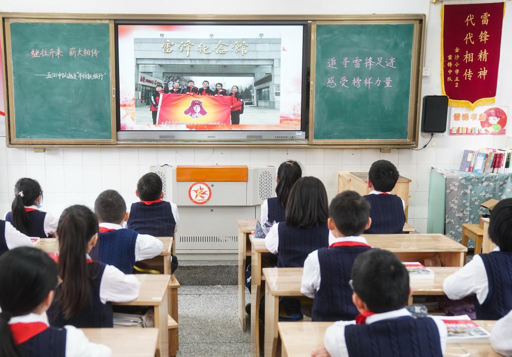 1963年3月,毛澤東同志題詞“向雷鋒同志學(xué)習”發(fā)表。金沙小學(xué)五(2)中隊輔導員向孩子們講述雷鋒事跡,并將中隊命名為“雷鋒中隊”。少先隊員們從身邊的“小善”做起,照顧軍烈屬、孤寡老人……60年來(lái),一屆又一屆的學(xué)生把“雷鋒”當作“偶像”。